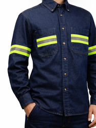 Camisa de mezclilla de 8 oz. de manga larga con cinta reflejante bicolor. Disponible para hombre.