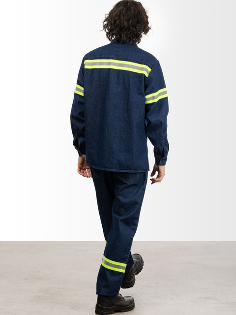 Camisola de mezclilla 14oz. de manga larga suavizada con cinta reflejante bicolor. Disponible para hombre.